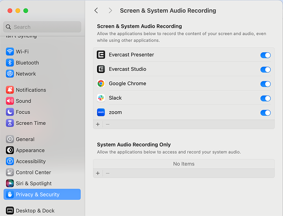 - In Screen & System Audio Recording, locate Evercast Presenter and make sure the toggle is on (blue).