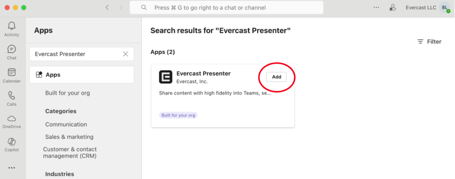 - Search for "Evercast Presenter" and install it by clicking Add.