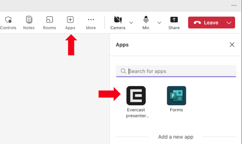 2. In your Teams meeting, click Apps on the top bar and select Evercast Presenter.