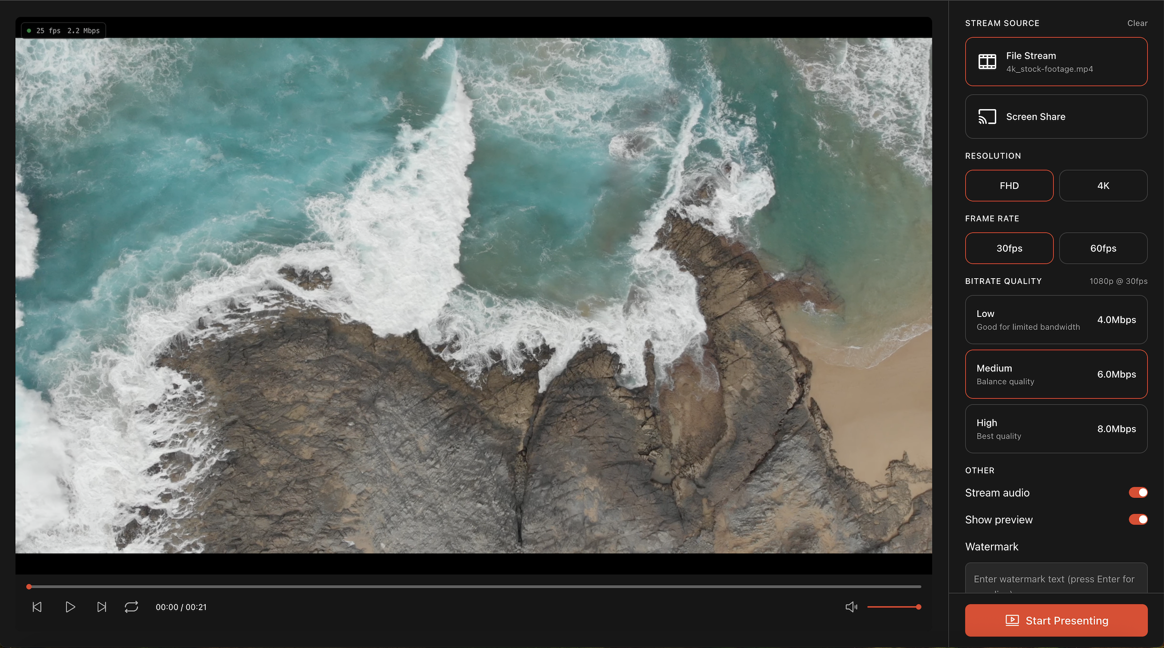 - Presenter will auto-detect the best settings for your source and bandwidth. You can also customize your settings.